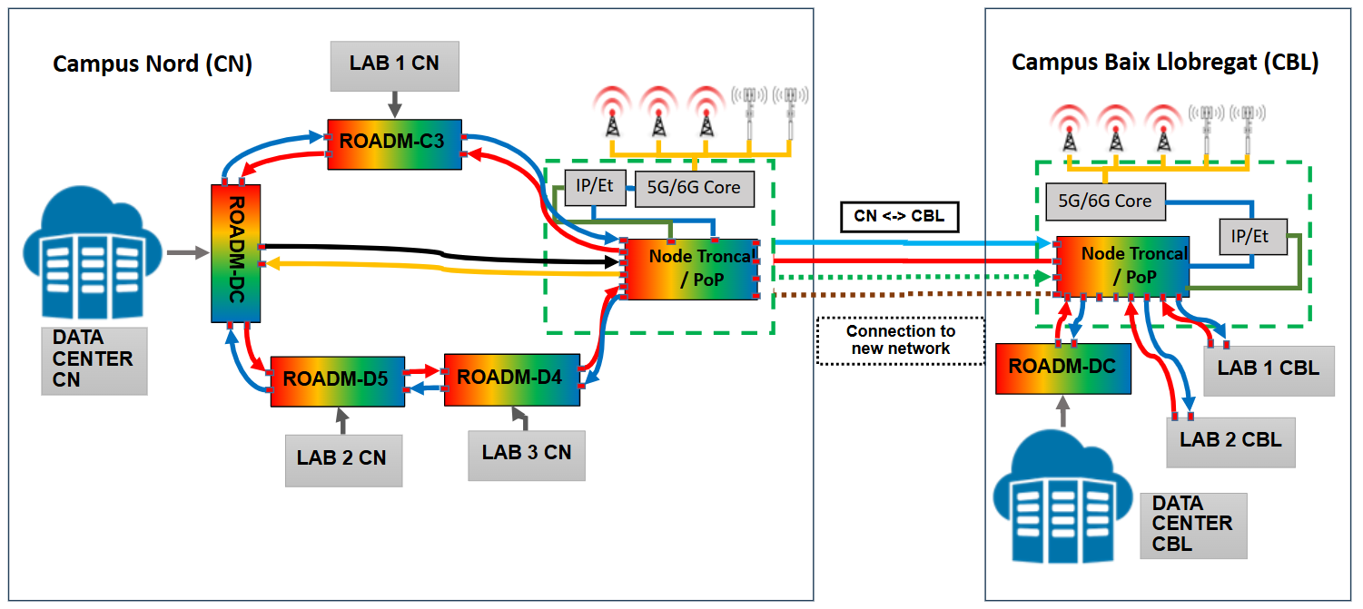 La infraestructura está interconectada mediante una red de fibra óptica que une los dos campus participantes y todos los componentes de la red, garantizando una latencia inferior a 1 milisegundo. En el Campus Nord, se ha desplegado un anillo de fibras ópticas redundante para aumentar la robustez frente a posibles fallos de conexión o equipos.